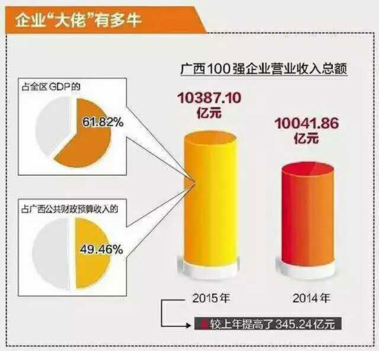 據(jù)了解,2016廣西企業(yè)100強(qiáng)的入圍門檻有了較大幅度提高,達(dá)到13.82億元;2016廣西100強(qiáng)企業(yè)營(yíng)業(yè)收入總額保持增長(zhǎng),達(dá)到10387.10億元。百?gòu)?qiáng)企業(yè)對(duì)廣西經(jīng)濟(jì)社會(huì)發(fā)展的貢獻(xiàn)依然顯著,營(yíng)業(yè)收入總額與全區(qū)生產(chǎn)總值比值達(dá)到61.82%,對(duì)廣西公共財(cái)政預(yù)算收入的貢獻(xiàn)達(dá)49.46%。