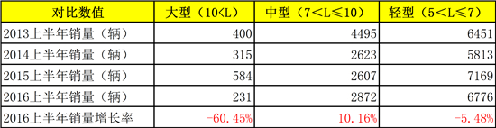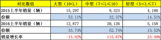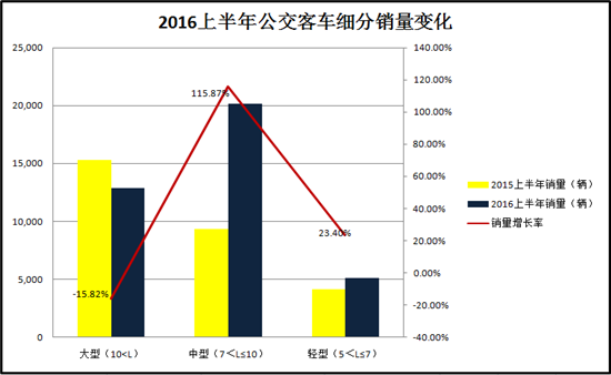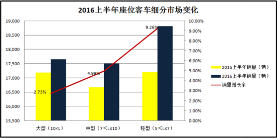 盡管座位客車上半年增長僅1.1%,但從各車型銷量變化來看,中型、輕型座位客車市場表現(xiàn)較好。