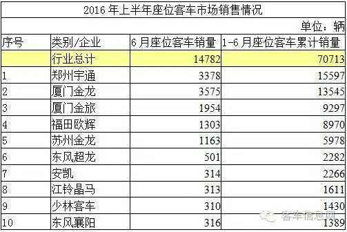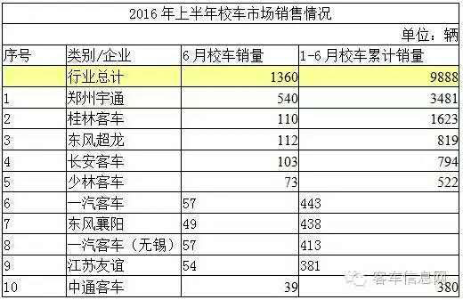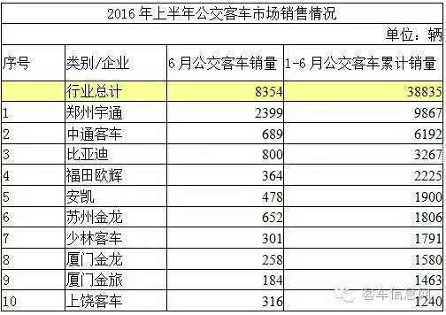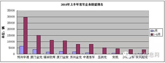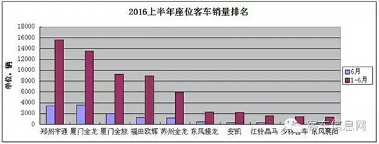 據(jù)中國(guó)客車統(tǒng)計(jì)信息網(wǎng)數(shù)據(jù)顯示,2016年1-6月,國(guó)內(nèi)累計(jì)銷售各類客車127092輛,其中,包括座位客車70713輛,公交客車38835輛,校車9888輛,臥鋪及其他客車7656輛。在各企業(yè)銷量中,宇通客車無論是整體銷量,還是各個(gè)細(xì)分市場(chǎng)銷量,均居行業(yè)之首,充分顯示了其作為行業(yè)龍頭企業(yè)的實(shí)力。