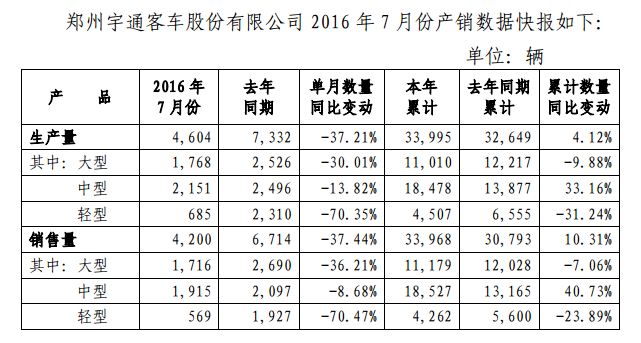8月5日,鄭州宇通客車股份有限公司公布2016年7月份產銷數(shù)據(jù)快報??靾箫@示,7月份,宇通銷售各類客車4200輛,同比下降37.44%;1-7月,宇通累計銷售各類客車33968輛,同比增長10.31%。