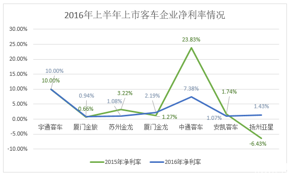 從上圖來(lái)看,代表各家公司的2015年凈利率的“綠線”,基本處于代表了2016年凈利率的“藍(lán)線”上方,也就反映出了客車今年確實(shí)不賺錢,除了宇通與去年持平以外,各家在2016年凈利率增長(zhǎng)都有所下降。