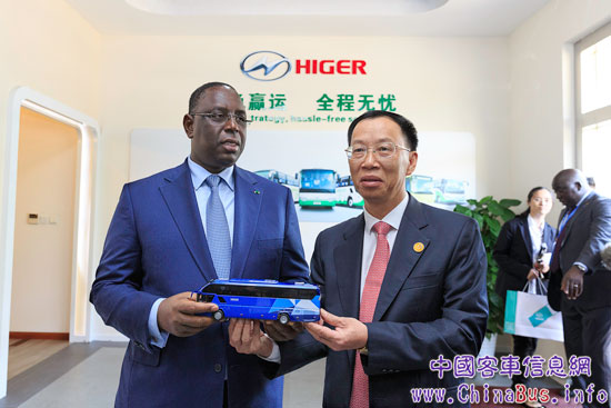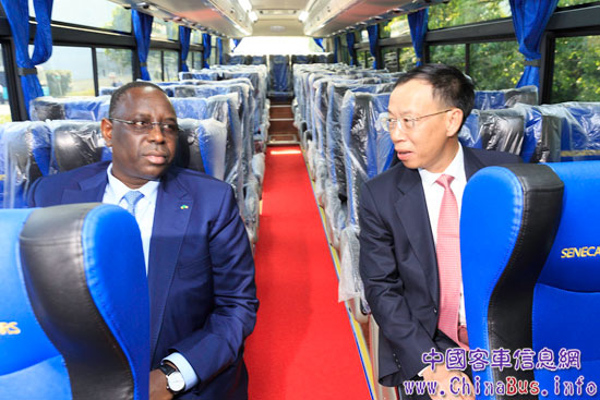塞內(nèi)加爾總統(tǒng)薩勒與蘇州金龍總經(jīng)理黃書平在海格客車前合影