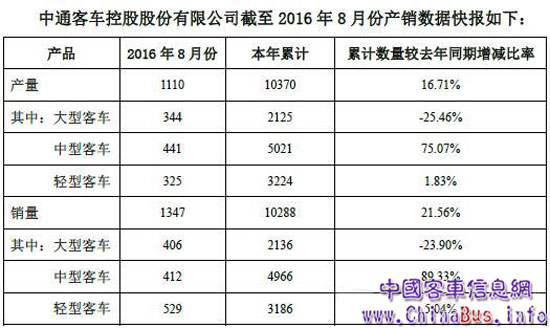 中通客車控股股份有限公司近日發(fā)布2016年8月份產(chǎn)銷快報(bào)。快報(bào)顯示,8月份,中通客車銷售各類客車1347輛,其中大型客車銷406輛,中型客車銷412輛,輕型客車銷529輛。