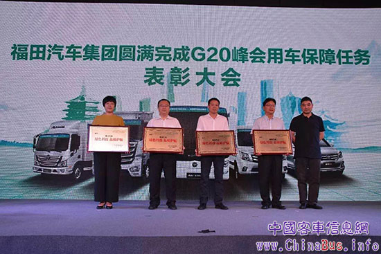 9月13日,以“踐行巴黎協(xié)定、建設綠色中國”為主題的福田汽車集團圓滿完成G20峰會服務保障任務表彰大會在浙江杭州隆重召開。杭州市交通運輸局領導為福田汽車集團以及參與峰會保障的180輛“綠色國賓車”頒發(fā)了“綠色科技 品質護航”榮譽勛章,承擔政要擺渡交通重任的福田歐輝新能源客車見證榮耀時刻。