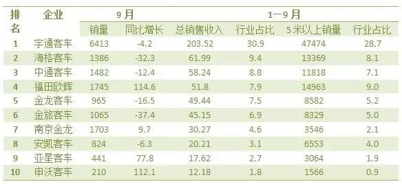 據(jù)中國(guó)客車統(tǒng)計(jì)信息網(wǎng)數(shù)據(jù)顯示,以2016年1—9月份總銷售收入為依據(jù),前三名分別為宇通客車、海格客車和中通客車。
