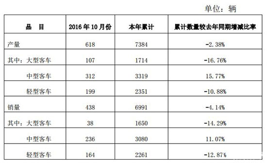 11月4日,安徽安凱汽車股份有限公司公布2016年10月份產(chǎn)銷數(shù)據(jù)。公告顯示,10月份安凱客車產(chǎn)銷分別為618輛和輛438。1-10月,安凱客車?yán)塾?jì)銷售各類客車6991輛,同比下降4.14%;累計(jì)生產(chǎn)各類客車7384輛,同比下降2.38%。