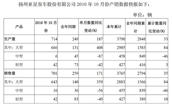 11月10日,揚州亞星客車股份有限公司發(fā)布2016年10月份產銷數據快報??靾箫@示,10月份,亞星客車銷售各類汽車701輛,比去年同期上升171%;生產各類客車714輛,較去年同期增長187%。今年1-10月,亞星客車累計銷售客車3765輛,同比增長35%;累計生產客車3790輛,同比增長33%。