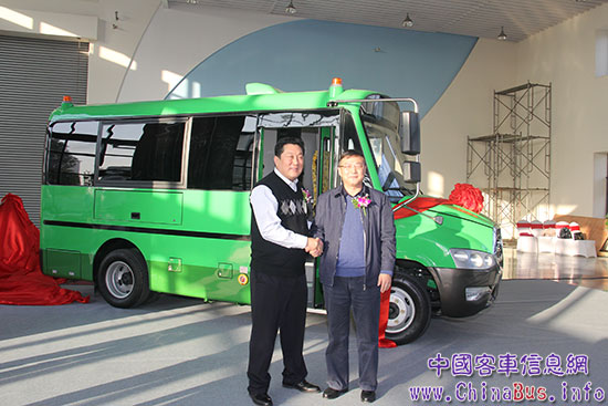 天津創(chuàng)研科技產(chǎn)業(yè)園投資有限公司董事長李宏和安凱客車總經(jīng)理查保應(yīng)在新車前合影