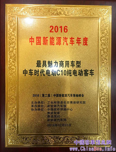 12月21日,工信部賽迪研究院在北京召開2016(第二屆)中國(guó)新能源汽車領(lǐng)袖峰會(huì)。峰會(huì)現(xiàn)場(chǎng)揭曉了2016中國(guó)新能源汽車十大領(lǐng)袖人物、最佳車型等獎(jiǎng)項(xiàng)。中車時(shí)代電動(dòng)董事長(zhǎng)兼總經(jīng)理申宇翔榮獲“2016中國(guó)新能源汽車領(lǐng)袖人物獎(jiǎng)”、C10純電動(dòng)客車摘得“年度最具魅力商用車型獎(jiǎng)”。