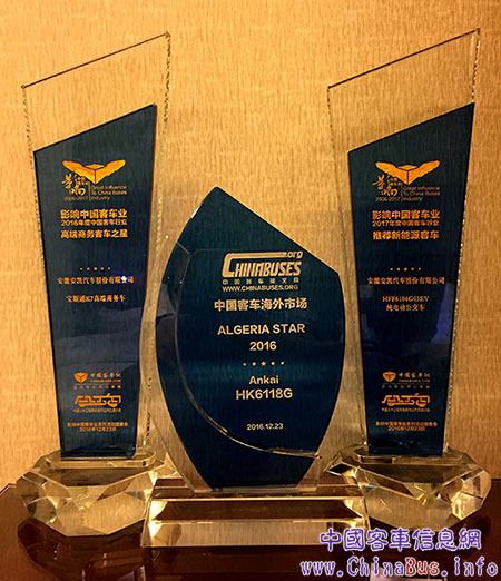 據(jù)了解,本次安凱所獲得的三個(gè)獎(jiǎng)項(xiàng)分別是:安凱寶斯通K7——“2016年度高端商務(wù)客車之星”稱號(hào),安凱HFF6104G03EV純電動(dòng)公交車——“2017年度推薦新能源客車”稱號(hào),安凱HK6118G——“2016年度中國(guó)客車阿爾及利亞之星”稱號(hào)。