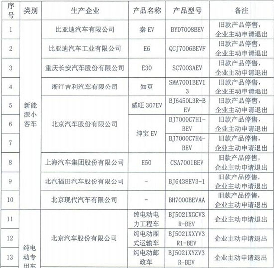 據(jù)了解,這28款產(chǎn)品包括10款新能源小客車及18款純電動(dòng)專用車。其中,10款新能源小客車分別為比亞迪秦EV、比亞迪E6、知豆D1、長(zhǎng)安E30、威旺307EV、兩款型號(hào)的紳寶EV、上汽E50、北汽福田以及北汽現(xiàn)代等車型。備注信息顯示,由于舊款產(chǎn)品停售,10款新能源小客車企業(yè)主動(dòng)申請(qǐng)退出。18款純電動(dòng)專用車退出補(bǔ)貼也是由企業(yè)主動(dòng)提出。