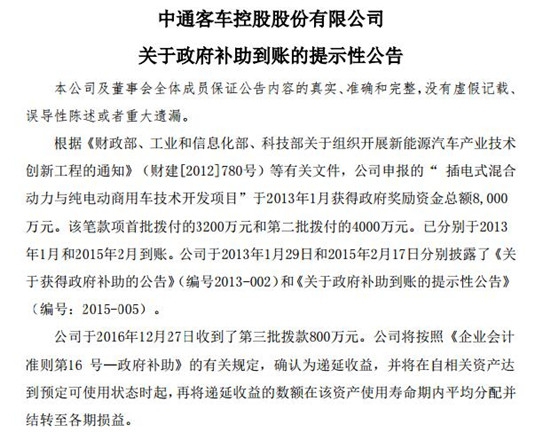 中通客車控股股份有限公司發(fā)布關(guān)于政府補(bǔ)助到賬的提示性公告。本公司及董事會(huì)全體成員保證公告內(nèi)容的真實(shí)、準(zhǔn)確和完整,沒有虛假記載、誤導(dǎo)性陳述或者重大遺漏。根據(jù)《財(cái)政部、工業(yè)和信息化部、科技部關(guān)于組織開展新能源汽車產(chǎn)業(yè)技術(shù)創(chuàng)新工程的通知》(財(cái)建[2012]780號(hào))等有關(guān)文件,公司申報(bào)的“ 插電式混合動(dòng)力與純電動(dòng)商用車技術(shù)開發(fā)項(xiàng)目”于2013年1月獲得政府獎(jiǎng)勵(lì)資金總額8,000萬(wàn)元。該筆款項(xiàng)首批撥付的3200萬(wàn)元和第二批撥付的4000萬(wàn)元。已分別于2013年1月和2015年2月到賬。公司于2013年1月29日和2015年2月17日分別披露了《關(guān)于獲得政府補(bǔ)助的公告》(編號(hào)2013-002)和《關(guān)于政府補(bǔ)助到賬的提示性公告》(編號(hào):2015-005)。