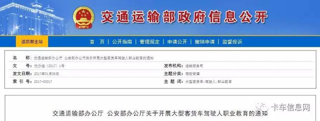 1月6日,交通運(yùn)輸部官網(wǎng)發(fā)布了《交通運(yùn)輸部辦公廳、公安部辦公廳關(guān)于開展大型客貨車駕駛?cè)寺殬I(yè)教育的通知》。以下為通知全文。