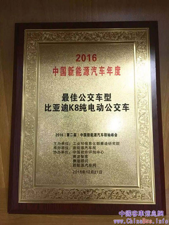 同月,在工業(yè)和信息化部賽迪研究院、新能源汽車(chē)報(bào)舉辦的2016(第二屆)中國(guó)新能源汽車(chē)領(lǐng)袖峰會(huì)上,比亞迪K8純電動(dòng)公交車(chē)又摘得一枚大獎(jiǎng),榮膺“2016年度新能源汽車(chē)最佳公交車(chē)型獎(jiǎng)”。