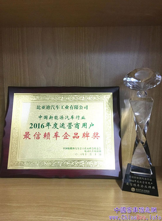 在電動(dòng)汽車(chē)資源網(wǎng)舉辦的中國(guó)新能源汽車(chē)總工技術(shù)峰會(huì)上,比亞迪獲得“2016年度運(yùn)營(yíng)商用戶(hù)最信賴(lài)車(chē)企品牌獎(jiǎng)”,充分體現(xiàn)了比亞迪新能源汽車(chē)產(chǎn)品極高的客戶(hù)口碑。