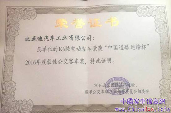 12月份,在中國(guó)客車(chē)網(wǎng)、中國(guó)土木工程學(xué)會(huì)城市公共交通分會(huì)舉辦的影響中國(guó)客車(chē)業(yè)系列活動(dòng)中,憑借產(chǎn)品在全球市場(chǎng)的優(yōu)秀示范或商業(yè)化運(yùn)營(yíng),比亞迪榮獲“影響中國(guó)客車(chē)業(yè)-2016年度中國(guó)客車(chē)海外市場(chǎng)國(guó)家之星”。