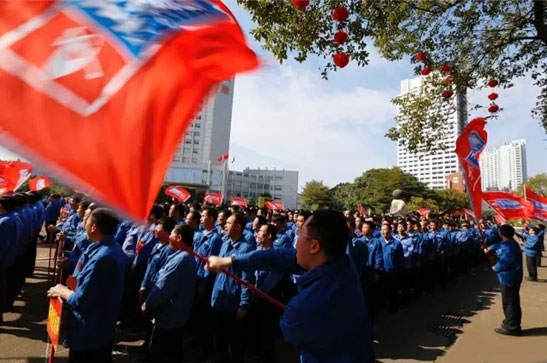 隊旗在手,軍令如山。大生產(chǎn)突擊隊接過領(lǐng)導(dǎo)們授予的大旗,帶領(lǐng)各自大軍雄赳赳,氣昂昂地開赴生產(chǎn)線。