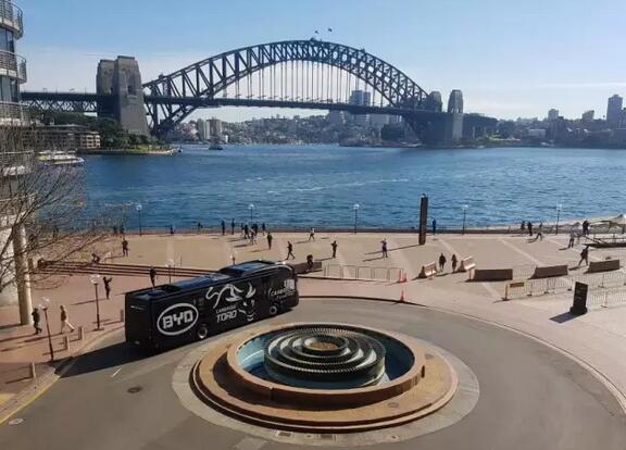 路試當(dāng)中的比亞迪電動巴士,遠(yuǎn)處是當(dāng)?shù)氐貥?biāo)悉尼大橋