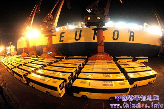 連云港港口等待裝船出口的安凱客車