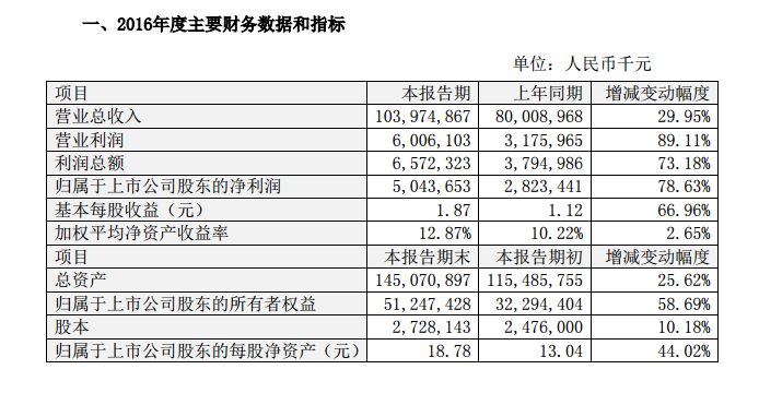 2月25日,比亞迪股份有限公司發(fā)布2016年度業(yè)績快報(bào)??靾?bào)顯示,2016年,比亞迪實(shí)現(xiàn)營業(yè)總收入1039.75億元,同比增長29.95%。其中歸屬于上市公司股東的凈利潤為50.44億元,同比增長78.63%。