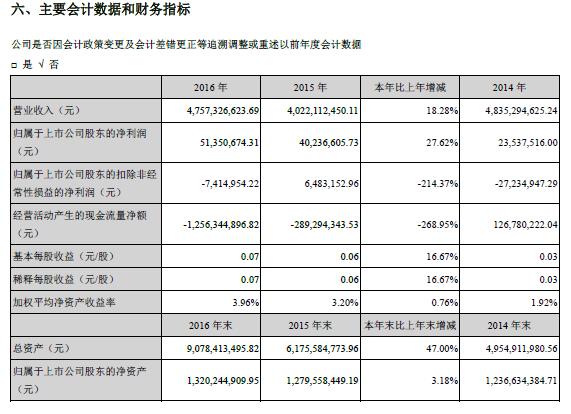 安凱客車昨日晚間披露2016年年報(bào),報(bào)告期內(nèi)公司實(shí)現(xiàn)營(yíng)業(yè)收入47.57億元,與上年同期相比增長(zhǎng)18.28%;歸屬于上市公司股東的凈利潤(rùn)5135.07萬元,同比增長(zhǎng)27.62%,扣非后的凈利潤(rùn)為-741.5萬元,同比下滑214.37%。
