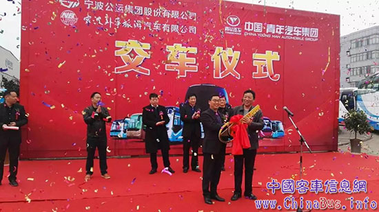 金華青年制造有限公司副總裁陳朝梁和寧波外事旅游汽車有限公司總經(jīng)理應(yīng)豪進行了交接金鑰匙儀式。