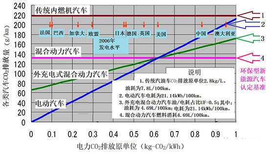 結(jié)論是:由于中國電網(wǎng)電力排放原單位高于0.63kg-CO2/kWh,所以在相當(dāng)長的一個時期內(nèi)都不適合大力推廣純電動汽車。即使推廣使用插電式混合動力汽車,也要看其燃料消耗與電耗的實際水平,是否能夠等于或者小于典型混合汽車。