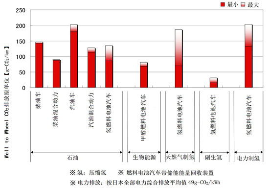 由此可見,氫燃料汽車的“熱”炒和氫燃料汽車“零”排放宣傳,是有悖于科學(xué)發(fā)展觀的。尤其值得我們注意的是:在日本,天然氣制氫、電力制氫的燃料電池汽車,即使加裝了車載儲能回收裝置,從采掘到車輪(Well to Wheel)CO2排放量,也遠(yuǎn)高于混合動力汽車。更何況,日本是在電力排放原單位0.49kg-CO2/kWh條件下制氫。我國呢?如果在電力排放原單位0.8356kg-CO2/kWh條件下制氫,可想而知,燃料電池汽車的CO2排放量該有多高!