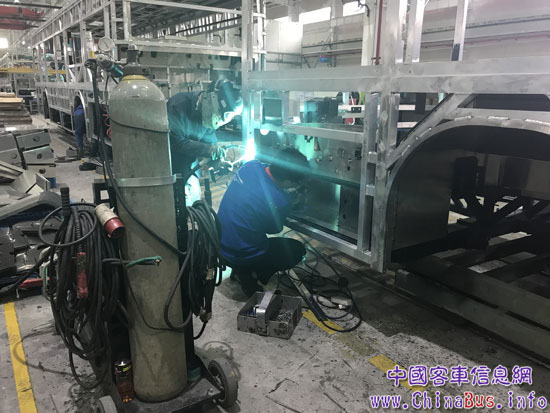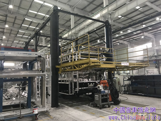 焊裝車間——整個(gè)車架的組裝和蒙皮在焊裝車間和鋁合金車間完成。為保證客車六大片合裝精度,比亞迪成立具備合裝機(jī)完整設(shè)計(jì)生產(chǎn)能力的專業(yè)團(tuán)隊(duì),根據(jù)車型需要靈活設(shè)計(jì)、裝配、調(diào)試合裝機(jī)。通過(guò)機(jī)械結(jié)構(gòu)配合電路程序控制,合裝機(jī)可變換車身左右側(cè)圍的定位位置,實(shí)現(xiàn)單、雙層,大、中巴車型的共線使用,通用性強(qiáng)。值得一提的是,比亞迪電動(dòng)客車采用鋁合金車身,車身骨架鉚焊結(jié)合,比鋼車身骨架減重40%,車身抗扭剛度提高20%。由于鋁合金優(yōu)異的耐腐蝕性能,與傳統(tǒng)車身相比,鋁合車身的壽命大幅提高。