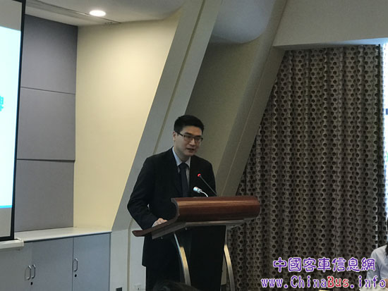(比亞迪商用車銷售事業(yè)部公關(guān)總監(jiān)肖海平介紹比亞迪客車產(chǎn)品優(yōu)勢)