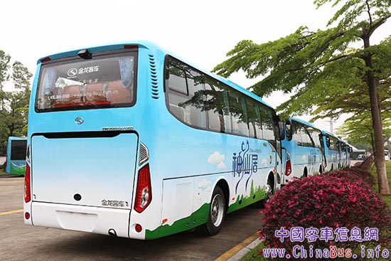 4月26日,十輛XMQ6802AY已交付神仙居旅游集團(tuán)。蔚藍(lán)基調(diào)的車身上,青峰座座,白云悠悠,讓人心生神往。據(jù)悉,該批車輛將于近期投入使用,接送游客從神仙居旅游景區(qū)集散中心到景區(qū)南門和北門?!吧讲辉诟撸邢蓜t名;水不在深,有龍則靈。”一輛輛美觀舒適的金龍客車,穿梭于仙山綠水中,為這5A級(jí)景區(qū)又增添了一道靚麗的風(fēng)景。