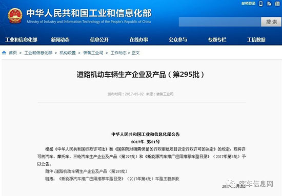 根據(jù)《中華人民共和國行政許可法》和《國務(wù)院對確需保留的行政審批項(xiàng)目設(shè)定行政許可的決定》的規(guī)定,現(xiàn)將許可的汽車、摩托車、三輪汽車生產(chǎn)企業(yè)及產(chǎn)品(第295批)和《新能源汽車推廣應(yīng)用推薦車型目錄》(2017年第4批)予以公告。