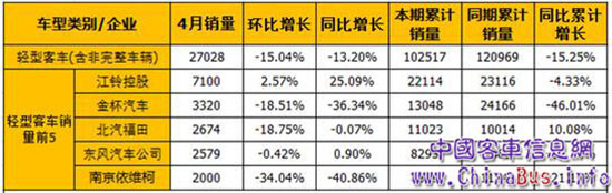 上表可見,環(huán)比上月,銷量前五企業(yè)1增4降,僅排名首位的江鈴控股實現(xiàn)增長;與2016年同期相比銷量前五企業(yè)3降2增,實現(xiàn)增長的兩家企業(yè)江鈴控股和東風(fēng)汽車公司同比分別增長25.09%和0.90%。下降的金杯汽車和南京依維柯降幅均超過35%,4月份銷量同比分別下降36.34%和40.86%,另一家企業(yè)北汽福田同比微降0.07%。從累計銷量看,2017年前4月,輕型客車(含非完整車輛)市場累計銷售102517輛,同比累計下降15.25%,累計降幅較前3月(-15.94%)略微縮窄。具體到4月銷量前五企業(yè)來看是4降1增,僅北汽福田一家企業(yè)實現(xiàn)增長,增幅為10.08%,傳統(tǒng)輕客“大佬”江鈴控股、金杯汽車和南京依維柯都處于下降區(qū)間,分別累計下降了4.33%、46.01%和21.19%。