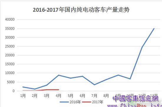 從上圖可知,雖然2016年純電動(dòng)客車產(chǎn)量起伏不定,但除了1-3月和7月份的單月產(chǎn)量在5000輛以下外,其余月份都超過了5000輛,年底兩個(gè)月更是爆發(fā)式增長(zhǎng)。反觀今年前4個(gè)月的生產(chǎn)情況,總產(chǎn)量?jī)H有1100輛??梢哉f(shuō),沒有最慘,只有更慘!