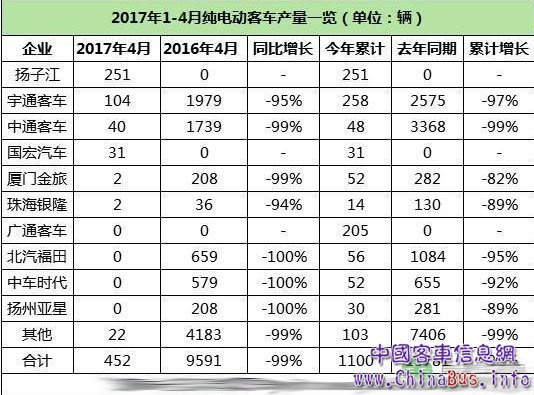 據(jù)工信部合格證數(shù)據(jù)統(tǒng)計(jì),2017年4月國(guó)內(nèi)新能源客車生產(chǎn)了1187輛,同比下降89%。其中,純電動(dòng)客車產(chǎn)量452輛,環(huán)比下降26.7%,同比下降95%。4月,插電式混合動(dòng)力客車產(chǎn)量725輛,同比下降55%。今年1-4月純電動(dòng)客車?yán)塾?jì)僅生產(chǎn)了1100輛,與去年同期15781輛比簡(jiǎn)直差太多。