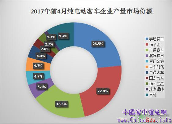 截止到4月,宇通客車?yán)塾?jì)生產(chǎn)純電動(dòng)客車258輛,市場(chǎng)份額為23.5%;揚(yáng)子江憑借4月份的大單,緊跟宇通客車其后,市場(chǎng)份額為22.8%;廣通客車(中興)以205輛的總產(chǎn)量,排在第三,市場(chǎng)份額為18.6%;其后分別是北汽福田、廈門金旅、中車時(shí)代、中通客車四家企業(yè),市場(chǎng)份額旗鼓相當(dāng);國(guó)宏汽車與揚(yáng)州亞星的市場(chǎng)份額分別為2.8%、2.7%;珠海銀隆前4月累計(jì)生產(chǎn)純電動(dòng)客車14輛,市場(chǎng)份額僅有1.3%;其他客車企業(yè)累計(jì)生產(chǎn)純電動(dòng)客車103輛,份額為9.4%。