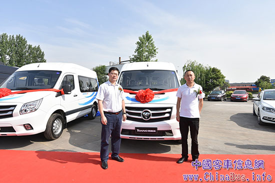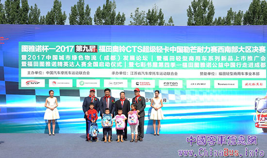【中國下一代教育基金會愛心速遞基金秘書長可勒先生和福田商用汽車集團商務汽車業(yè)務總監(jiān)輕型商用車事業(yè)本部執(zhí)行副本部長潘林波先生為福田圖雅諾S商運版國五新品揭幕】
