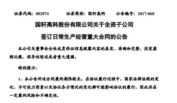 國軒高科股份有限公司關(guān)于全資子公司簽訂日常生產(chǎn)經(jīng)營重大合同的公告