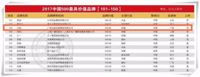 6月22日,世界品牌實(shí)驗(yàn)室(World Brand Lab)在北京發(fā)布了2017年《中國(guó)500最具價(jià)值品牌》榜單,玉柴榮登中國(guó)500最具價(jià)值品牌第103位,品牌價(jià)值由2016年的281.95億元躍升為345.96億元,首次突破300億元。