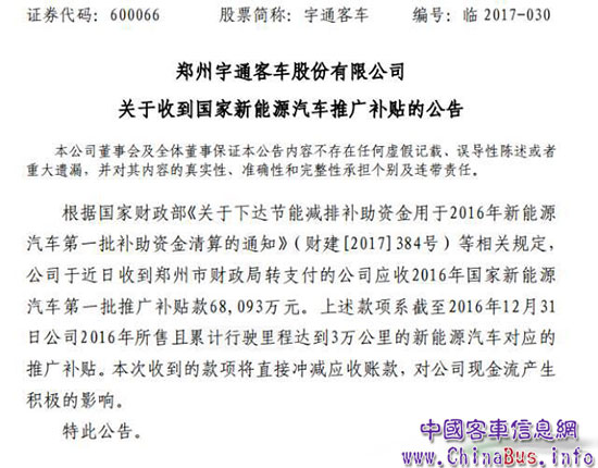 宇通客車6月30日晚間消息,公司于近日收到鄭州市財(cái)政局轉(zhuǎn)支付的公司應(yīng)收2016年國(guó)家新能源汽車第一批推廣補(bǔ)貼款6.8093億元。公告顯示,上述款項(xiàng)系截至2016年12月31日公司2016年所售且累計(jì)行駛里程達(dá)到3萬(wàn)公里的新能源汽車對(duì)應(yīng)的推廣補(bǔ)貼。
