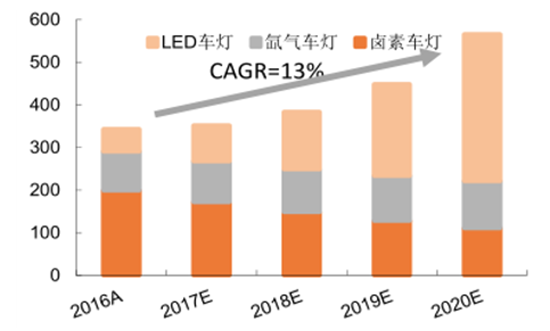 國內(nèi)車燈市場復合增速預計13%,LED車燈市場規(guī)模迅速擴張。根據(jù)預測,全球車燈市場會在未來幾年逐步增加,而LED車燈市場增速較快,超越汽車行業(yè)整體增速。國內(nèi)車燈市場受益于車燈升級更新速度加快,產(chǎn)品單價提升,有望獲得更高的成長速度。