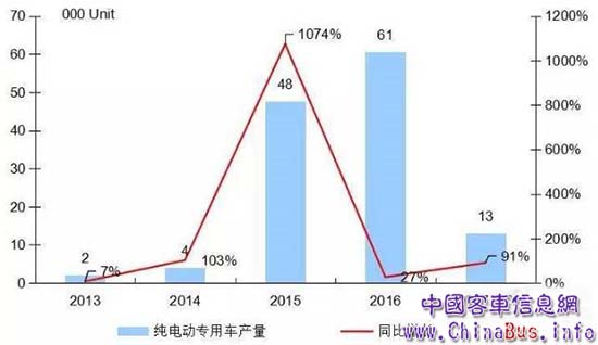 2017年6月,國(guó)內(nèi)新能源專用車市場(chǎng)共計(jì)生產(chǎn)6420輛(全部為純電動(dòng)車型),比去年同期大幅增長(zhǎng)152%,其中大部分是純電動(dòng)物流車;1-6月,純電動(dòng)專用車市場(chǎng)累計(jì)產(chǎn)量達(dá)到1.3萬(wàn)輛,比去年同期的6806輛增長(zhǎng)幾乎翻番,達(dá)到91%。