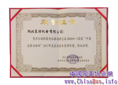 前不久在“2017北京國際道路運(yùn)輸、城市公交車輛及零部件展覽會”中,湖北泰特機(jī)電有限公司研發(fā)的輪轂電機(jī)驅(qū)動橋總成SM500-3榮獲“最佳客車零部件獎”。