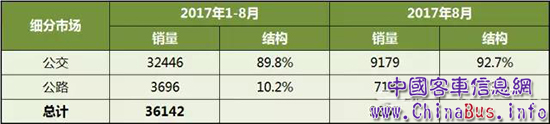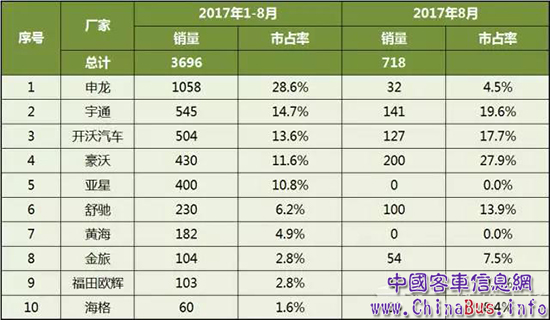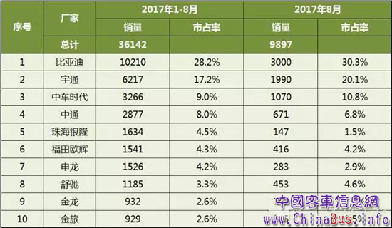 8月單月前10銷量為:比亞迪3000、宇通1990、中車1070、中通671、舒馳453、福田416、萬象363、申龍283、金旅245和豪沃200。