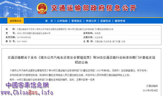 日前,交通運(yùn)輸部發(fā)布《城市公共汽電車運(yùn)營安全管理規(guī)范》等34項(xiàng)交通運(yùn)輸行業(yè)標(biāo)準(zhǔn)和部門計(jì)量檢定規(guī)程。