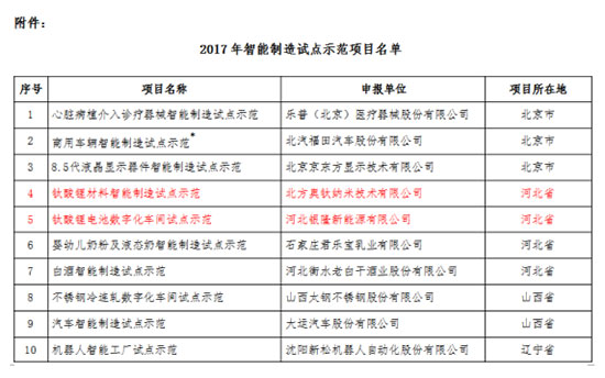 智能制造已成為當(dāng)今全球制造業(yè)的發(fā)展趨勢(shì),是我國(guó)現(xiàn)階段推進(jìn)兩化深度融合的主攻方向。10月16日,工信部公布了2017年智能制造試點(diǎn)示范項(xiàng)目名單,銀隆新能源子公司——北方奧鈦納米技術(shù)有限公司、河北銀隆新能源有限公司憑借“鈦酸鋰材料智能制造試點(diǎn)示范項(xiàng)目”與“鈦酸鋰電池?cái)?shù)字化車間試點(diǎn)示范項(xiàng)目”成功入圍。