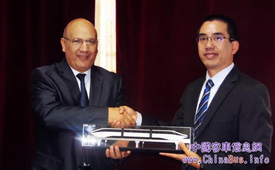 比亞迪中東非洲汽車銷售事業(yè)部總經(jīng)理黃志學(xué)(右)將云軌模型贈(zèng)與亞歷山大市交通管理局主席KhaledEleiwa