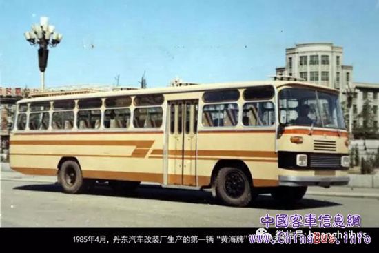 圖:1985年4月,丹東汽車改裝廠生產(chǎn)的第一輛“黃海牌”DD680G客車