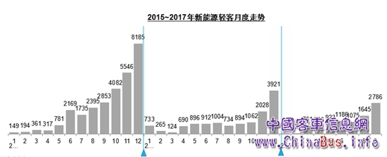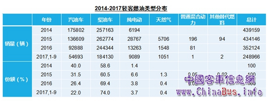燃油類型方面表現(xiàn)為柴油輕客份額上升,純電動輕客起落明顯。2014年柴油輕客占比為58.6%,2015年柴油輕客占比為60.5%,2016年柴油輕客占比達69.4%,2017年1-9月柴油輕客占比竟高達74.0%。而純電動輕客的占比并沒有出現(xiàn)持續(xù)增加,2014年純電動輕客占比為1.4%,2015年純電動輕客的占比為6.6%,2016年純電動輕客的占比為3.8%,2017年1-9月純電動輕客的占比僅為3.7%。