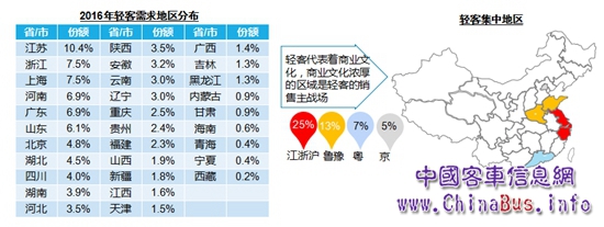 值得注意的是,輕客需求主要分布區(qū)域為江蘇、浙江、上海、山東、河南、北京、廣東。輕客代表著商業(yè)文化,商業(yè)文化濃厚的區(qū)域是輕客銷售的主戰(zhàn)場。